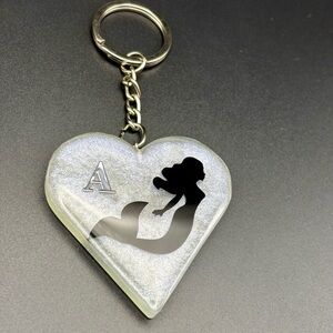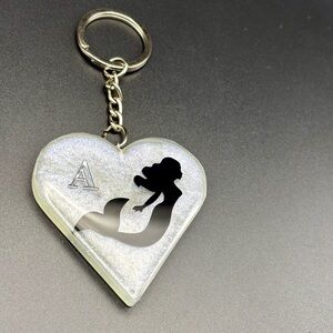 Keychain in photo is available for purchase! Features a mermaid with the letter “A” on a crystal white background.