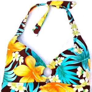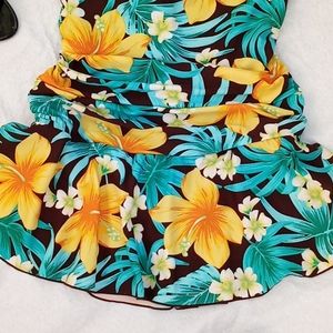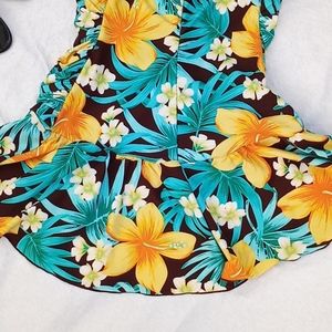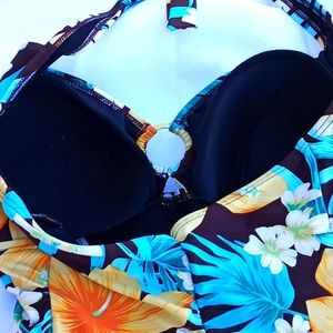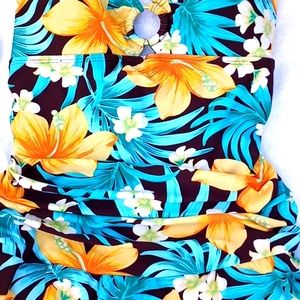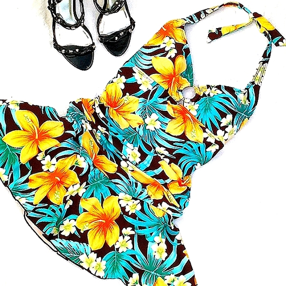 Halter dress has padded cups, rucshing down the sides & flounced hem