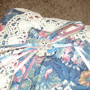 Has a cute kitty charm glued to the corner of the front frame with skinny ribbons.