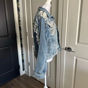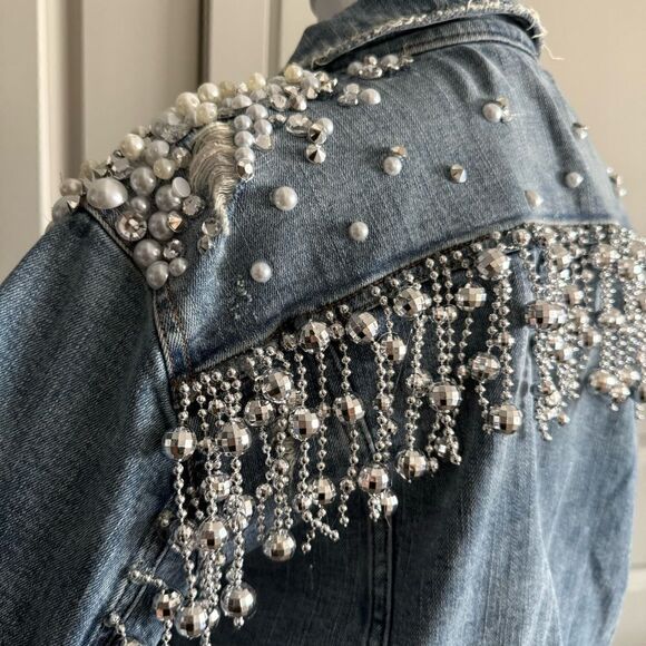 Custom Made Rhinestone and Pearl Bedazzled Disco Fringe Jean Jacket Size L