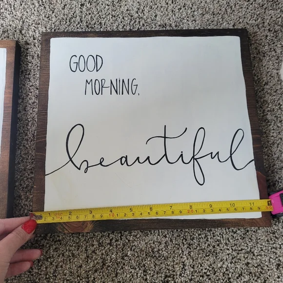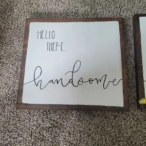 Set of two. Like new. "Hello there handsome" " Good morning Beautiful". Hand painted on real wood. Purchased from an Etsy Shop DK & company. Both are roughly 12x12