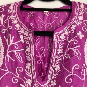Fuchsia Pink bohemian tunic with white embroidery Silk Custom made In india Slit side detail