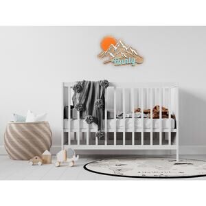 Measuring 16” x 11.5”, this personalized sign is the perfect size to hang above a crib, bed, or on a gallery wall. Its neutral wood tones with pops of color make it a versatile fit for modern, rustic, or adventure-themed rooms.
