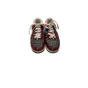 These custom Nike Air Swoosh sneakers feature a unique Y2K rapper design in red, black, and white. Perfect for those looking to stand out with style and comfort. Available in Women's US size 7.5.
