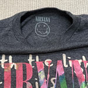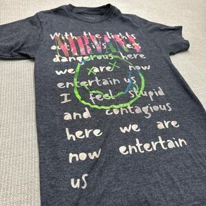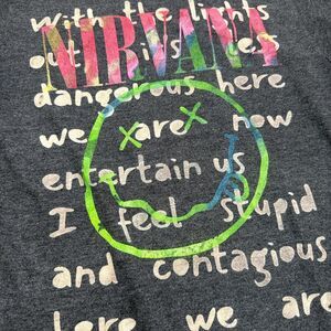 Reworked dark grey Nirvana band tee, custom bleached out lyrics to Smells Like Teen Spirit
