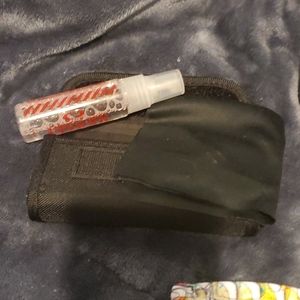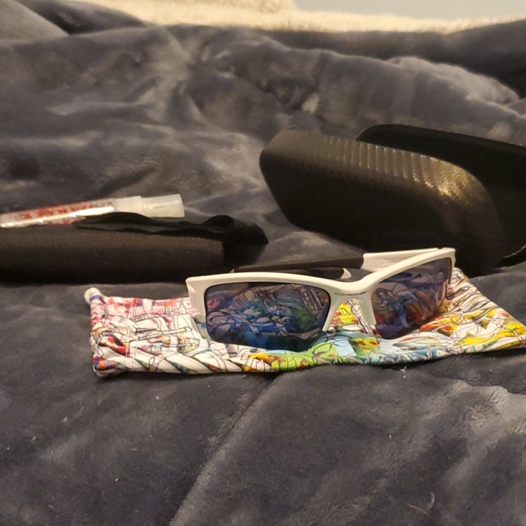 The Oakley set comes with the glasses case, cleaning set, and protector! They are customs and have been lightly used, therefore reflecting the price.