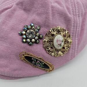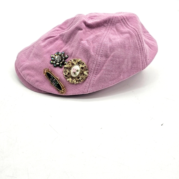 Custom One Of A Kind Pink Linen Pageboy Hat With Vintage Brooches