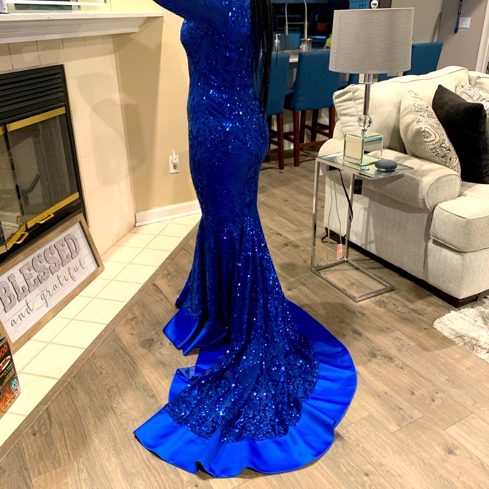 New “No tags” because it’s Custom made. Royal blue, deep plunge V neck form fitted prom dress. Bustle in the back that can be snapped to dress. Also has a wrist bustle to hold the train. Approximately a size 8, but has room to be altered, if necessary.