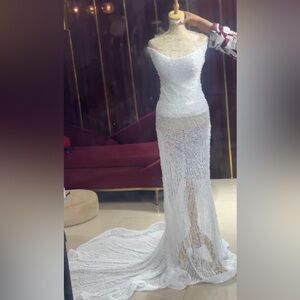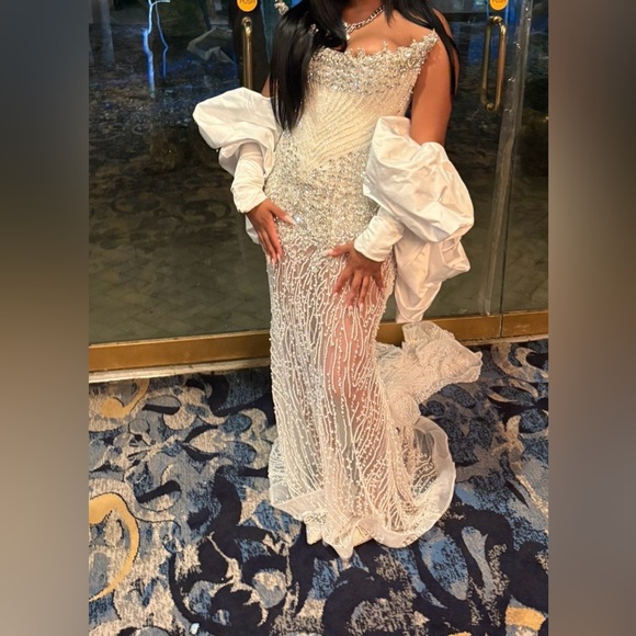 This is a custom-made, one-of-a-kind gown designed to make a statement. The dress features detailed pearl and rhinestone hand-beading throughout the bodice and skirt, an adjustable corset that shapes and supports the body, and a sheer, intricately embellished skirt that catches the light beautifully. The detachable sleeves provide the option for two distinct looks, and the elegant train enhances the overall dramatic effect. The dress was worn once for prom, professionally cleaned, and remains in excellent condition. Perfect for prom, formal events, galas, sweet sixteens, photoshoots, or any occasion that calls for a high-end, custom look. Message for negotiation, additional photos, or questions!!