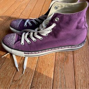 Custom Purple Rhinestone Converse. These are in great condition. I added the purple rhinestones to the toe and outer side using E6000 glue. I wore these to the Taylor Swift Eras Tour. Size 11.5 women’s