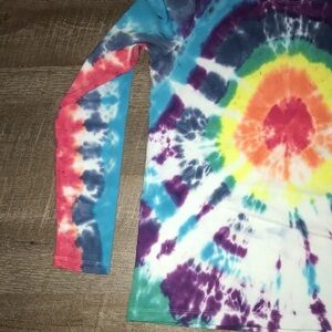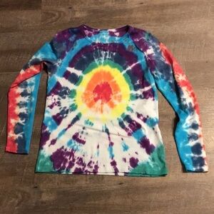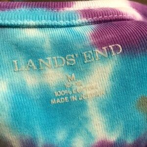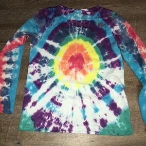 Custom Lands’ End Bullseye Tie Dye Long Sleeve T-shirt size M. Rainbow bullseye. 100% cotton shirt. With pleated sleeve tie dye. Handmade. Dye may run in wash initially. Has been washed. Really cool shirt. Upcycled very good preowned condition shirt.