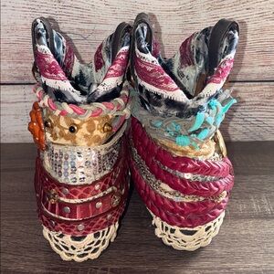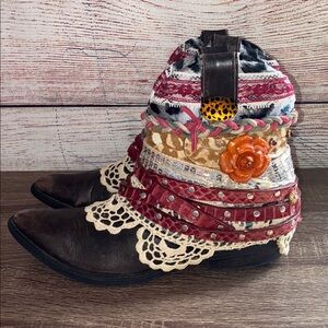 Custom ReWorked Nine West Brown Boots Size 7N Stylish ankle boots with black leather and red fabric accents. Perfect for a bold look. The size tag is covered up but I wear a 7.5-8 and have a narrow foot so I’d say def fits a size 7