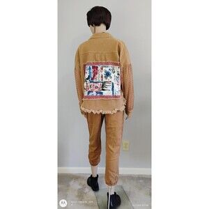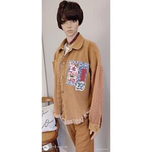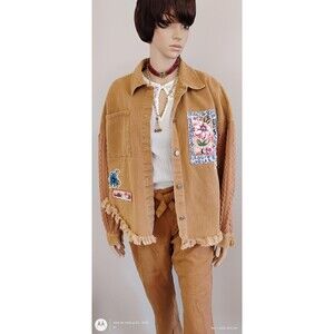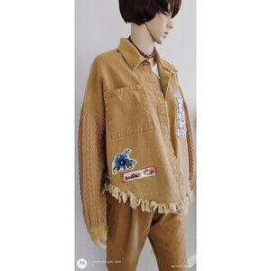 Embrace your individuality with this Womens Jacket unlike any other. Crafted from brown denim with knit sleeves and metal buttons, this Custom Refashioned Jacket boasts an uneven fringe hem for a touch of edgy charm. Complete with appliques and funky patches, this one-of-a-kind piece exudes a unique boho design that is perfect for the woman who dares to stand out from the crowd.