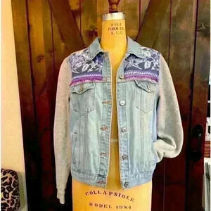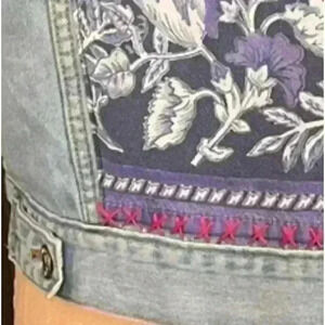 Custom Repurposed Forever 21 Jean Jacket with vintage fabric front yoke and back. Trimmed with handstitched contrast fuchsia embroidery thread. Fleece sleeves, slanted welt pockets. REF# J210