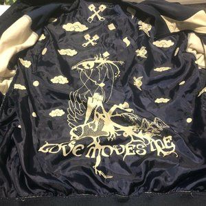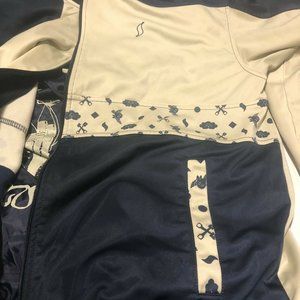 t’s a tan and navy blue jacket with embroidered chest logo and pattern detail on the pockets and mid section. The interior lining has a huge design that says Love Moves Me. The back has two embroidered what looks like keys criss crossed. There are zippers in the armpits that open up to air them out and there is some fleece like material in the sleeves and interior of the jacket. It’s a 100% polyester and a super cool custom piece. Size is determined by tag so please also see measurements. Thanks