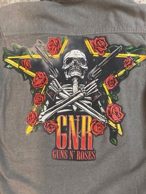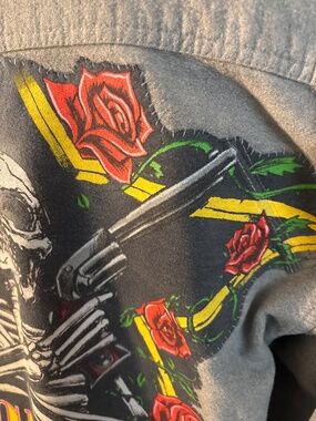 One-of-a-kind upcycled custom DIY piece! I’ve taken a classic Field & Stream button-down and professionally sewn a large Guns N’ Roses graphic tee onto the back. This features the iconic GNR skull and crossed pistols design surrounded by red roses from the 80’s.