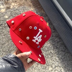 Brighten up your outfit with this vibrant Red and white LA Rhinestone snapback cap,adorned with colorful embellishments. Perfect for adding a fun touch to any look.