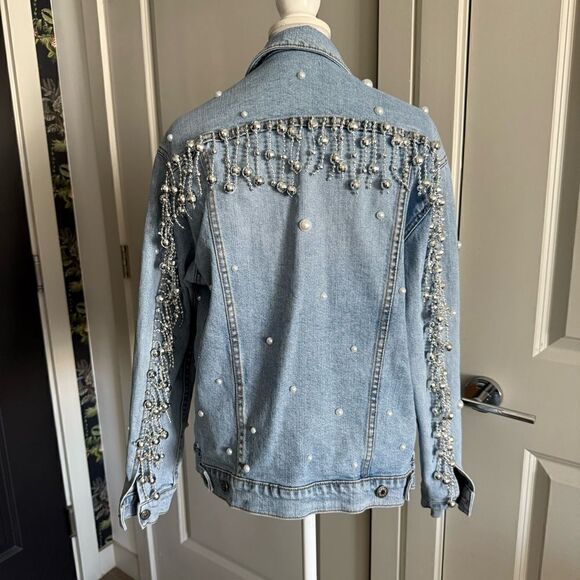 Custom Rhinestone and Pearl Bedazzled Disco Fringe Oversized Jean Jacket Size S