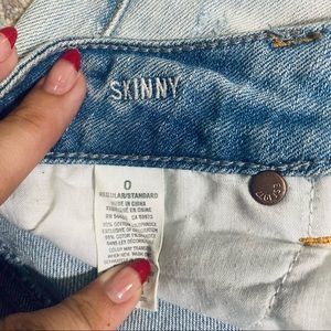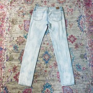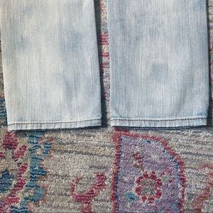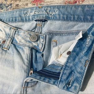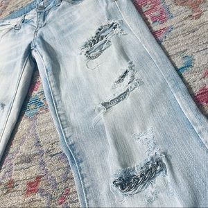 Customized American Eagle jeans with chain detail in the rips. Low rise, beautiful light wash, size 0. I love these jeans so much but I am just not a 0 anymore. These jeans are custom and unique. One of a kind.