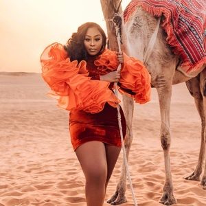 Worn once for about an hour for pictures. Lovely ruffle detail. Pictures don’t give justice