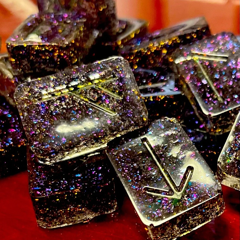 Gorgeous chromatic glitter Rune Stones. Handmade so some imperfections are to be expected. Can accept custom orders if interested.