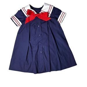 This is a unique, custom-made dress with a distinct sailor-inspired design. The dress is crafted from comfortable cotton fabric and features short sleeves with an A-line silhouette, creating a flattering and fun look. It showcases a distinctive sailor collar with a tie at the front, adding to its nautical charm, and includes a charming caplet feature on the back. This dress is perfect for themed parties, cosplay, or adding a touch of vintage flair to your wardrobe. This dress is estimated to be a size 6-7