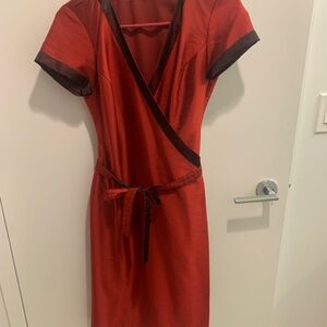 This dress was made by a seamstress in Thailand. It is raw silk on the outside, in red and black. It is a classic wrap dress style. Shoulder seams are 14.5” apart from seam to seam, waist is 29”, and the shoulder to hem measurement is 40”.
