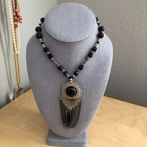 Custom Silver Beaded Choker Necklace with Fringed Medallion Drop Pendant