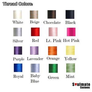 Embroidery thread colors: Black, white, beige ,chocolate, silver, red, light pink, hot pink, purple, lavender, orange, yellow, royal, baby blue, green, mint