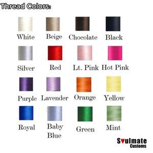 Embroidery thread colors: Black, white, beige ,chocolate, silver, red, light pink, hot pink, purple, lavender, orange, yellow, royal, baby blue, green, mint