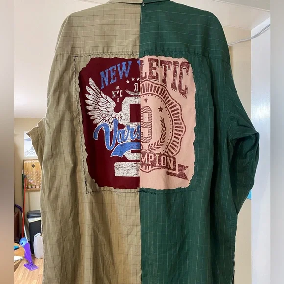One of a kind shirts made by myself @LocalsVintage. Everything is thrifted, upcycled, and unisex. This shirt is marked at a men’s XXL. Many other designs and custom orders are available and just a message away. #splittee #retro #upcycle #oneofakind #buttonup