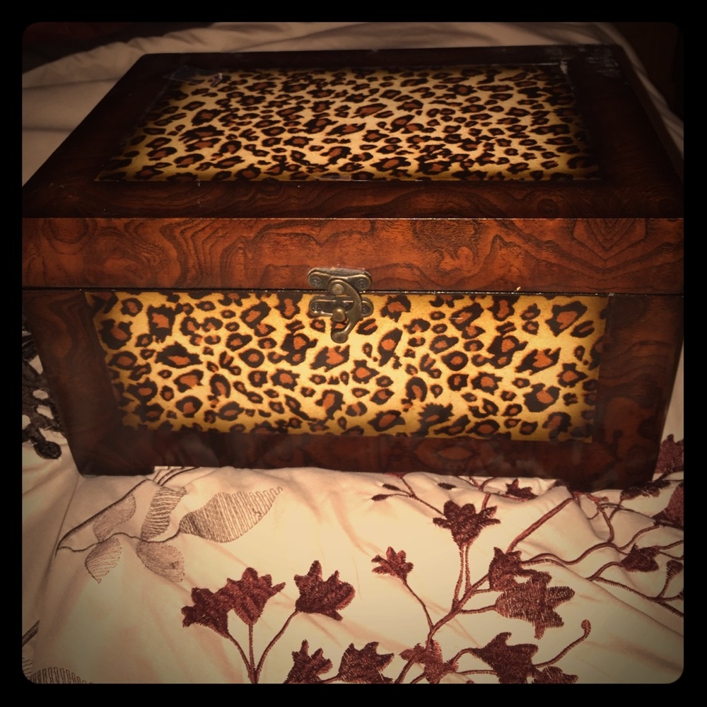 Leopard printed wood storage box. Excellent condition. 5-7 inches deep. Can be used to store any personal items. (** jewelry not included, used for promotional and example only :))