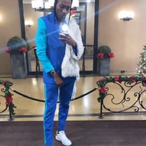 Custom Suit . Royal Blue . Turquoise sleeve. . Pants with Side inseam trim to match sleeve. Pants size 32 . Slim fit
