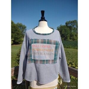 Embrace the spirit of fall with our Womens Sweatshirt, refashioned to perfection for a unique look. The plaid flannel trim around the neckline and rolled-up sleeves give this sweatshirt a trendy edge. Featuring a large fall graphic on the front and an unfinished hem, this piece exudes a funky and boho vibe. Stay cozy and stylish all season long with this loose and comfy sweatshirt.