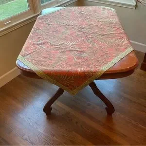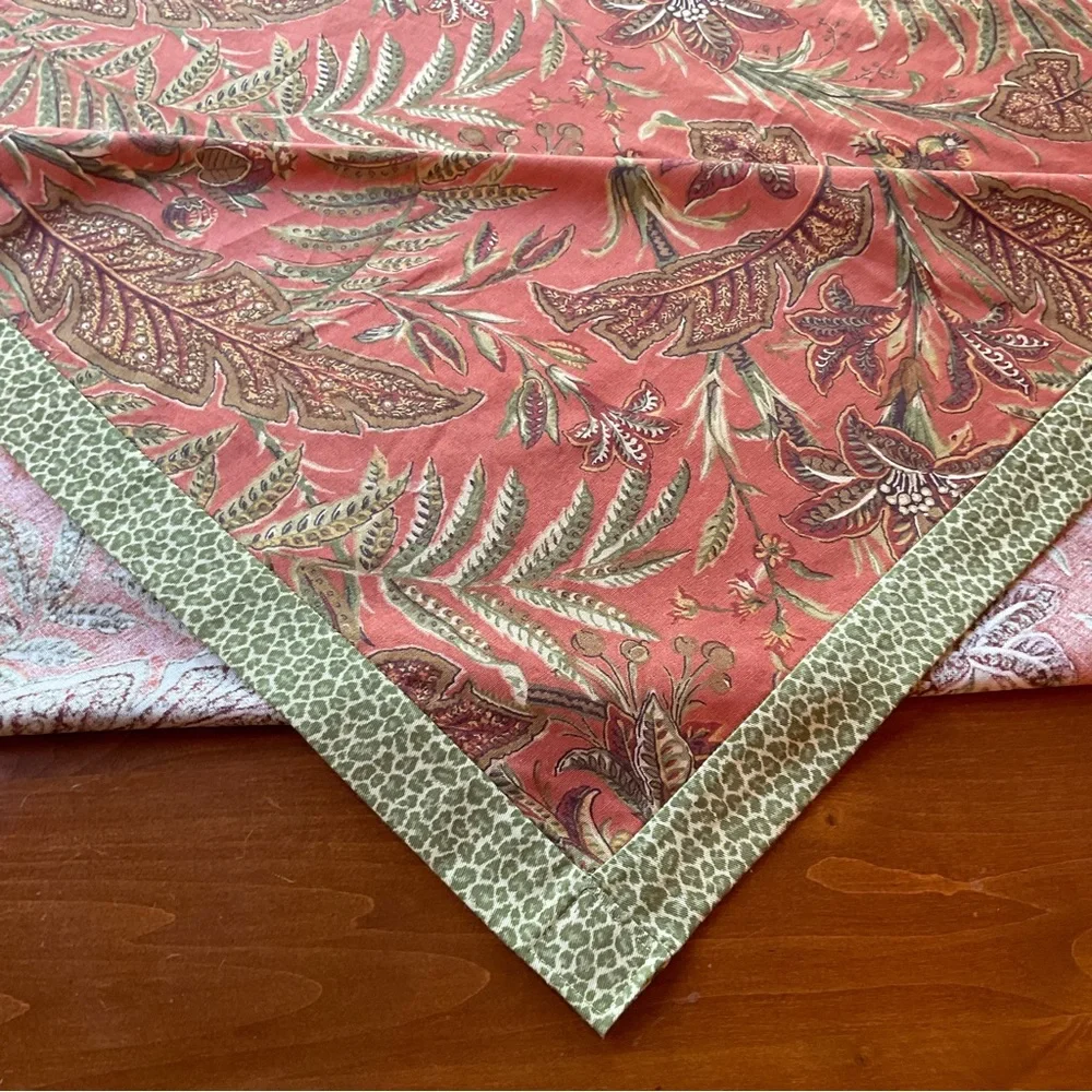 Custom-made accent pillow measures, 56.75” X 48”. Hand sewn with high quality, designer fabric. The table cloth is a tropical cotton twill design fabric. The design is of tropical plants and flowers, in shades of green, cinnamon, brown, and gold on an orange background. There is 1.5” band in an olive green animal print that frames this beautiful fabric. New, never been used. Made with love ❤️ recommend dry cleaning.