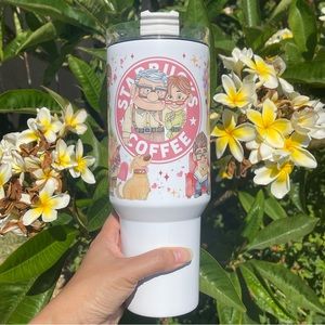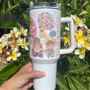 Custom Tumbler Disney Carl and Ellie 40 oz Double-wall vacuum insulation. Brand new. 2nd generation comes with rotating cover with three positions: a straw opening designed to resist splashes with a seal that holds the reusable straw in place, a drink opening, and a full-cover top for added leak resistance.
