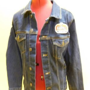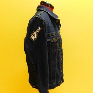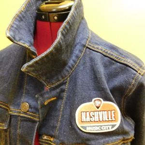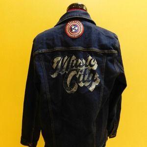 Custom Unique Nashville Music City Dark Jean Jacket. 2 breast pockets and 2 waist pockets. 2 Inner pockets. Thread Fast Apparel Jacket. Has Guitar patch, round Nashville Music city patch and Oval Music City patch (see pics). Also has Music City Silk screened on back center of jacket.