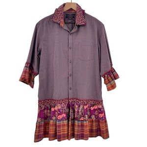 Custom Up-Cycled Tunic 3/4 Sleeves Button Up Ruffle Hem Mixed Print Purple | M/L