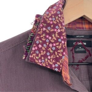 Custom, one-of-a-kind upcycled button up tunic top. Made with a men's long sleeve button up shirt and embellished with floral and plaid print fabrics at the hem, sleeves and collar and embroidered on the back. 100% cotton.