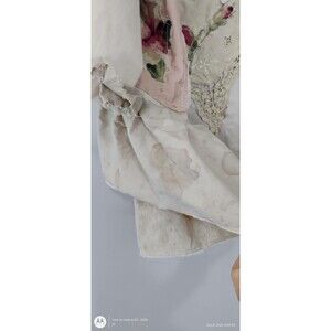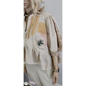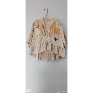 Embrace the whimsical beauty of this Womens Upcycled blouse. This top features intricate lace & crochet trim, romantic rose appliques, and a statement-making large ruffle along the hem. The full 3/4 length sleeves and tea-dyed fabric create a unique aged aesthetic, perfect for those seeking shabby chic hippie vibes. Stand out in style with this one-of-a-kind rustic top that exudes charm and individuality.