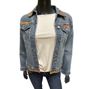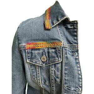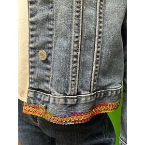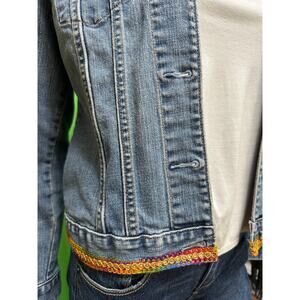 Custom Upcycled GAP Denim Jacket Fringe & Rainbow Trim Sz Small S