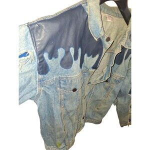 Custom Vintage Denim Jacket Trucker Size L Sauce Blue Plaid Drip Rizz Ripped