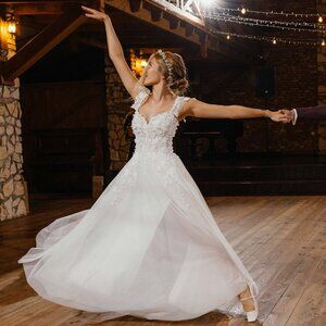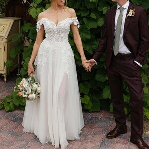 Worn once to my wedding! Bought in Poland from a custom bridal boutique (Suknie Estera), where all dresses are hand-sewn in Europe. I typically wear a size 4 dress, 34B bra size, and am 5'6 (I wore flats with the dress).