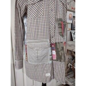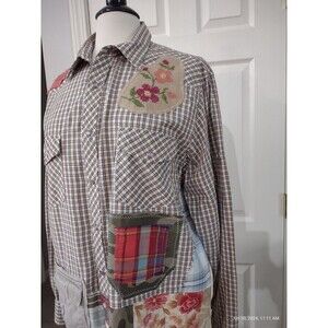 Make a statement with our Plaid Western Shirt Upcycled Funky Boho Patchwork Cottage Core Shabby Chic Shacket. This reimagined mens shirt combines the best of western style with eco-conscious upcycling, creating a truly eye-catching piece. With pearl buttons and a charming cottage core aesthetic, this shacket is the perfect blend of style and sustainability.