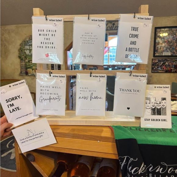 Set of humorous wine label greeting cards. Perfect for gifting. Features witty sayings.