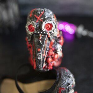 Sculpted plague doctor heads on the back