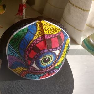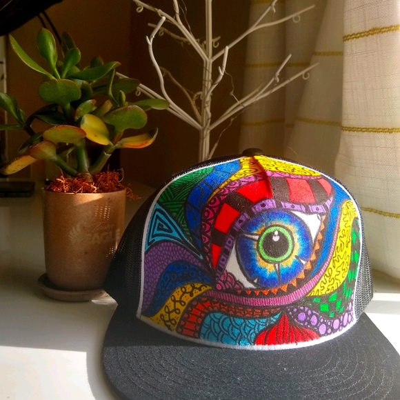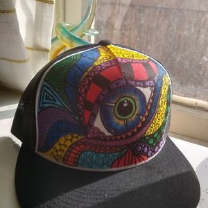Hand painted trucker hats, canvas front and adjustable mesh snap back.