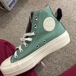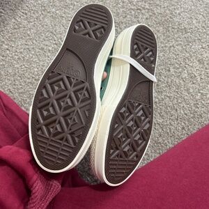The prettiest custom platform converse. These are from my personal closet. I spent over $100 customizing them. Only wore them once or twice. There are zero signs of wear. The base of them are cream not white! Main colors are brown, and and green. Mens size 5 but womens size 7. SO cute.