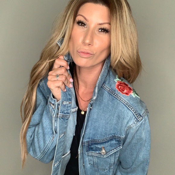 Custom detailing on vintage moto denim jacket. Rose detailing on back shoulders. Size s/m very thick great quality. Barely worn