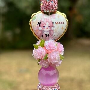 Rhinestone pink beaded pen adorned with acrylic and floral accents.